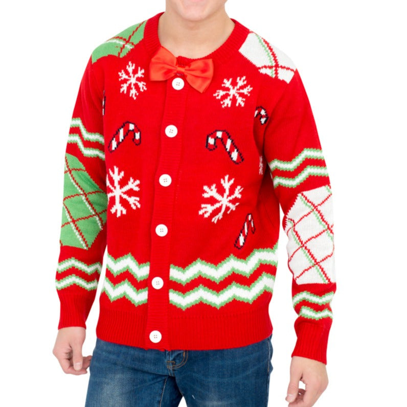 Women's Candy Canes and Snowflakes Button Up Ugly Christmas Sweater with Bowtie