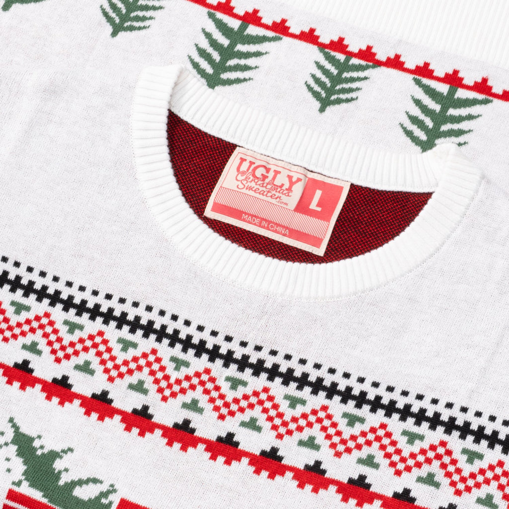 Bring holiday joy and festive fun to your wardrobe with the Arnold Truck and Trees White Ugly Christmas Sweater.