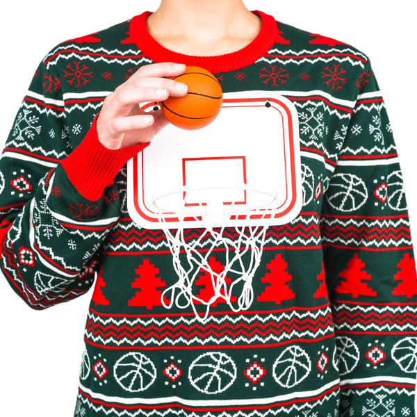 - Includes an adult unisex ugly Christmas sweater, a detachable basketball net, and a small basketball. Does not include anything else.