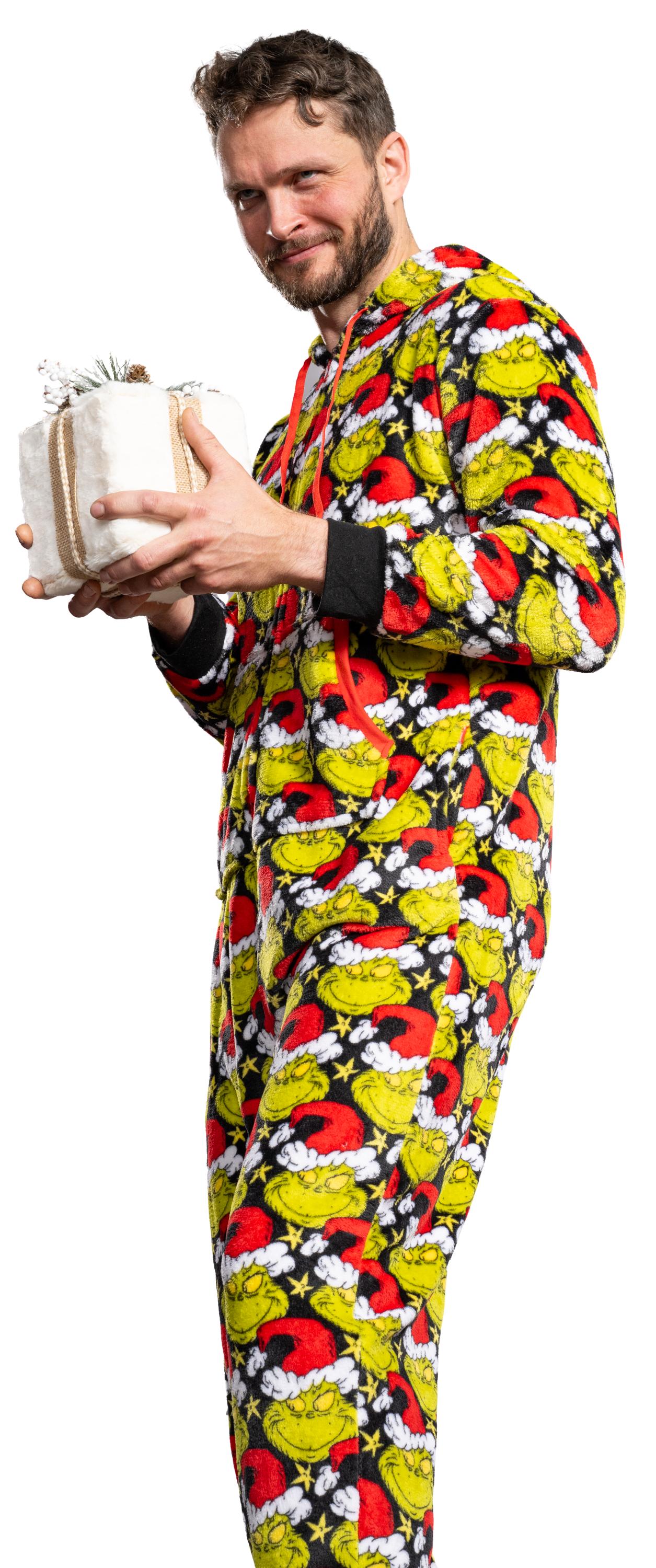 Grinch with Santa Hat Face All Over Pajamas Jumpsuit Christmas Union Suit with Hood and Pockets for Mens and Womens