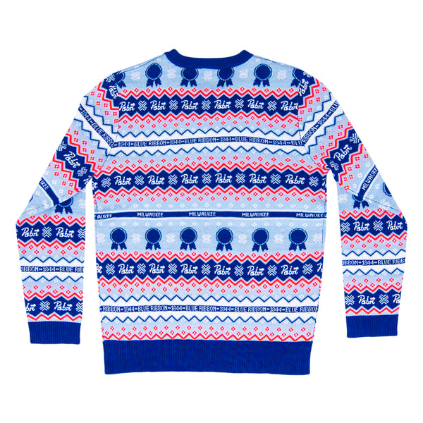 Put a cold one on your chest this holiday season! If you like beer, the holiday season, ugly Christmas sweaters, making friends and family laugh, then this Pabst Blue Ribbon ugly Christmas sweater might be your perfect ugly Christmas sweater. If you need a great ugly Christmas sweater to wear this holiday season when you want to dress to impress during the holiday season, then you've come to the right place. Pabst Blue Ribbon is an iconic beer. It's logo is known around the world, and if you'd like to pay tribute to the beer and also the 1970s and 1980s, then this is the ugly Christmas sweater for you.