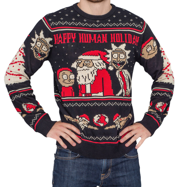 What's better than an ugly holiday sweater featuring Rick and Morty? Feeling as tipsy as one of Santa's elves?  Nope.  Wearing an ugly Christmas sweater featuring Rick, Morty, and Santa Claus! Our officially licensed Rick and Morty Happy Human holiday ugly Christmas sweater is totally hilarious and ultra-comfortable. Now you can show everyone how much you love Rick and Morty at the same time express your holiday cheer to the world.