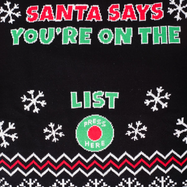 Dress to impress this holiday season - feel as tipsy as one of Santa's elves while doing it too! If it's fun you're looking to create this Christmas, then you should show up to your next holiday party wearing this hilarious, interactive Santa Says LED sweater. Whether your friends or family have been naughty or nice, just have them "push the button" on the sweater and you'll give them a memory at Christmas time that they'll never forget. An interactive ugly Christmas sweater makes people the hit of the party just as much as a LED ugly Christmas sweater can draw attention to any wearer that wants to dazzle everyone.