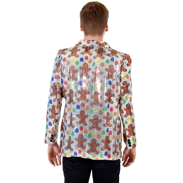 If you're looking for that one-of-a-kind cool holiday jacket our Sequin ugly holiday blazer jackets are for you! And nothing reminds us of the holiday more than the image of the gingerbread man. Our sequin gingerbread man blazer jacket is a one-of-a-kind design that features a mix of gingerbread man and gumdrops all over and is made of 100% polyester and is completely hand washable.