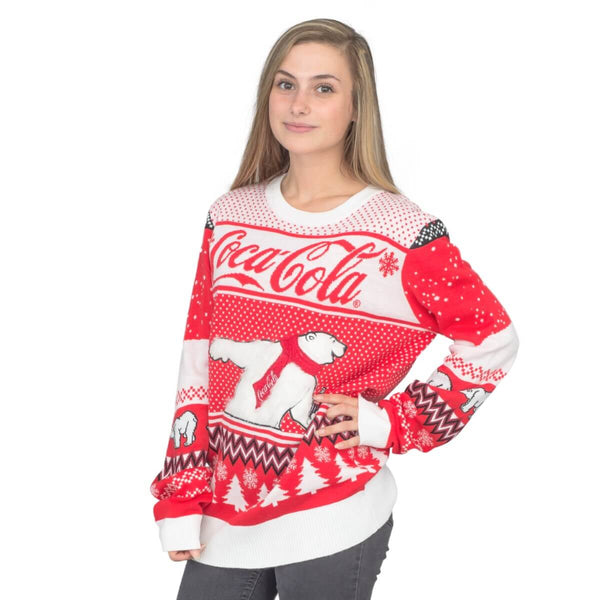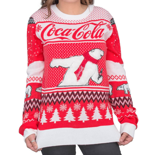 Be as warm as a polar bear this holiday season during family time when you sport this officially licensed Coke ugly Christmas sweater. Featuring the Coke brand’s iconic polar bear mascot, this Women’s Coca-Cola Polar Bear Coke and Trees Ugly Christmas Sweater is fun, comfortable, and classic. After all, isn’t Coke just as iconic and American as the Christmas season, time with family, and giving gifts? Wear this sweater and you'll feel as tipsy as one of Santa's elves after he's had fun on Christmas Eve.