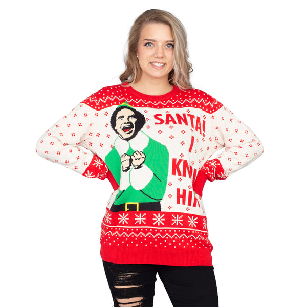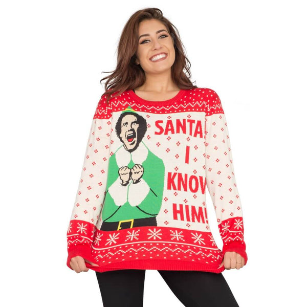 Show off your sense of humor this year while showing off your love for Will Ferrell and his classic movie Elf during the holiday season, when you wear this officially licensed Elf Buddy Santa, I Know Him ugly Christmas sweater out with your friends, to your next family gathering, or after hours, work Christmas party. There's nothing funnier than Will Ferrell, and if you're a fan of the movie Elf, then you can't go wrong when you buy and wear this hilarious Will Ferrell Elf movie ugly Christmas sweater. (It'll make anyone who wears it experience that feeling of being tipsy that is so common in Santa's elves on Christmas Night.)